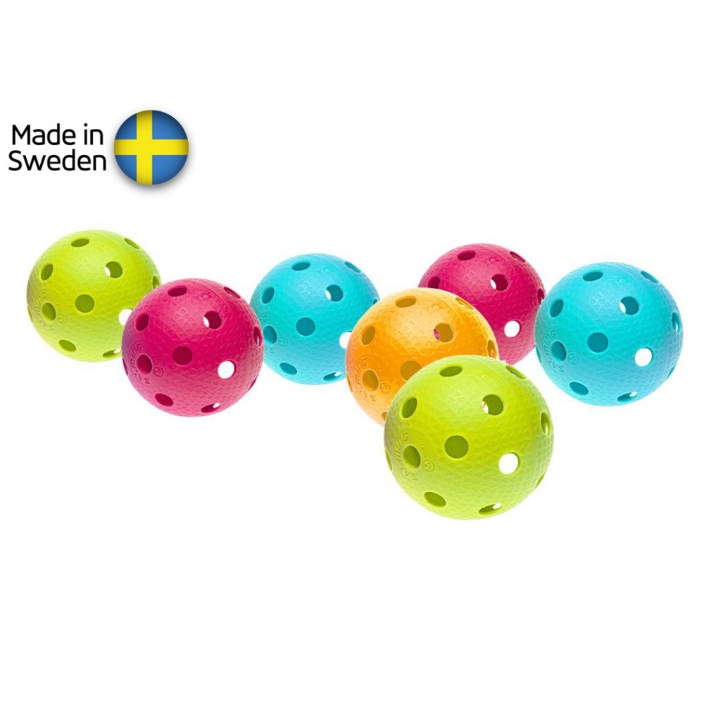 Sáček obsahuje 10 míčků - 3x modrá, 3x růžová, 2x oranžová a 2x limetková. Míček Aero je profesionální certifikovaný florbalový míček se skvělými letovými vlastnostmi. Míčky se nabízí buď v bílé variantě, která je určena pro soutěžní utkání, ale i v zajímavých barevných variantách. Povrch míčku pokrývají důlky v jednou takové hustotě (Design Patent 001709940-0001) než je běžné u ostatních míčků na trhu. Míček tak léta stabilně a předvídatelně. Uvnitř míčku je v horizontální i vertikální ose zakomponovaný stabilizační prstenec (X-Bar), který ještě více zvyšuje stabilitu míčku v letu a zvyšuje jeho odolnost. Je vyroben ve Švédsku, za použití nejlepších dostupných výrobních technik. IFF certifikované.
