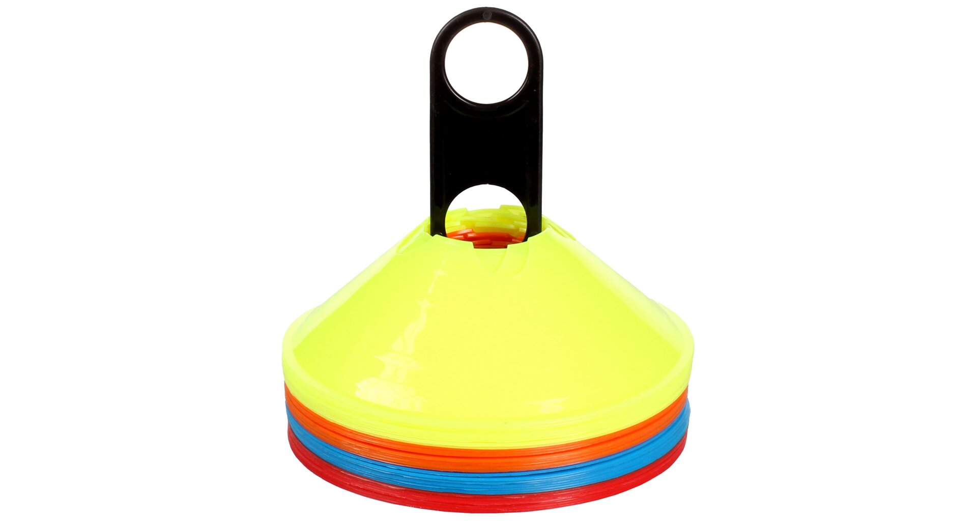 Sada 32 víceúčelových met ve čtyřech různých barvách pro vytvoření tréninkové dráhy, s výřezy pro překážkové tyčky.